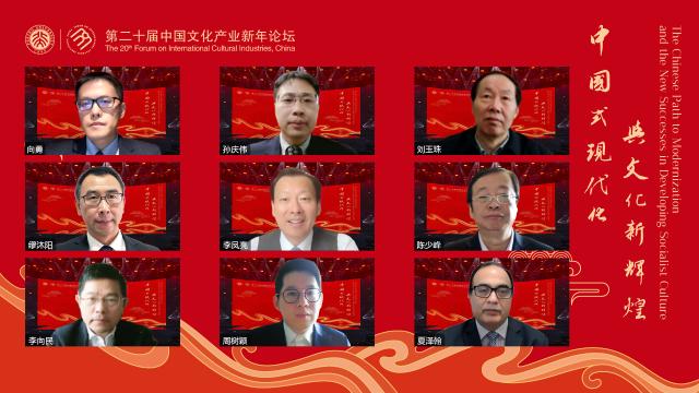 2023年1月7日上午,第二十届中国文化产业新年论坛正式开幕。本届新年论坛聚焦“中国式现代化与文化新辉煌”的核心主旨,包括主论坛、主题论坛、创意管理峰会、智库对话、青年学者研讨会等六大类十场主题活动。北京大学党委常委、副校长孙庆伟,中国文物保护基金会理事长、国家文物局原局长刘玉珠,文化和旅游部产业发展司司长缪沐阳,南方科技大学党委书记、讲席教授、全球城市文明典范研究院院长李凤亮,北京大学哲学系教授、北京大学文化产业研究院学术委员会主任陈少峰,南京艺术学院副院长、紫金文创研究院院长李向民,泡泡玛特首席消费者运营官周树颖,联合国教科文组织驻华代表处主任夏泽翰(Shahbaz Khan)等专家学者出席了开幕式暨主论坛。主论坛由北京大学艺术学院教授、北京大学文化产业研究院院长向勇主持。