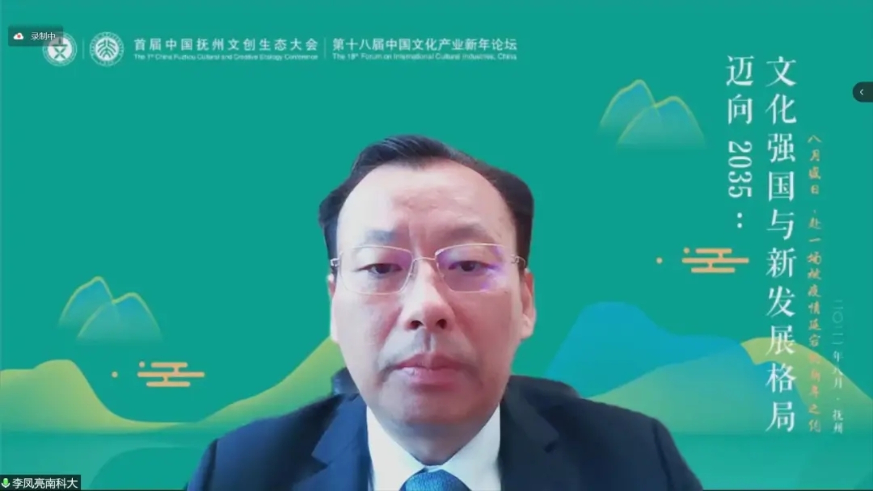 李凤亮发表了关于《新格局 新文化 新消费》的主题演讲。李凤亮表示,此次论坛的举办正值两个一百年交汇,恰逢百年未有之大变局,文化产业发展进入到全新的历史情境。我们理应推进“双循环”新发展格局,从文化自信自觉、文化创新、质量优先、创新驱动四方面推进文化走向。最后,李凤亮对促进文化消费提出四点思考,对共同创造文化消费的新蓝海提出殷切展望。