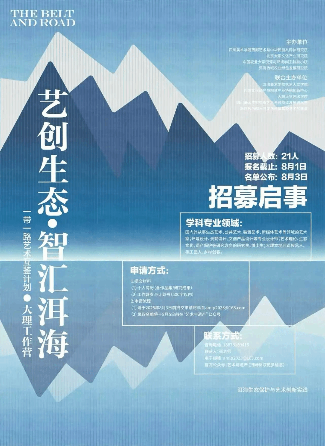 为深入贯彻习近平生态文明思想,践行“绿水青山就是金山银山”理念,结合“两山理论的大理实践暨面源污染治理研讨会”的召开,四川美术学院西部文化遗产与创意产业协同创新中心,北京大学文化产业研究院、中国农业大学资源与环境学院、云南农业大学等单位拟于2025年8月11-17日在大理洱海共同举办“一带一路”艺术互鉴计划·大理工作营。本次活动旨在通过艺术创作与生态保护的跨界融合,探索生态价值转化新路径,展现大理生态文明建设成果。