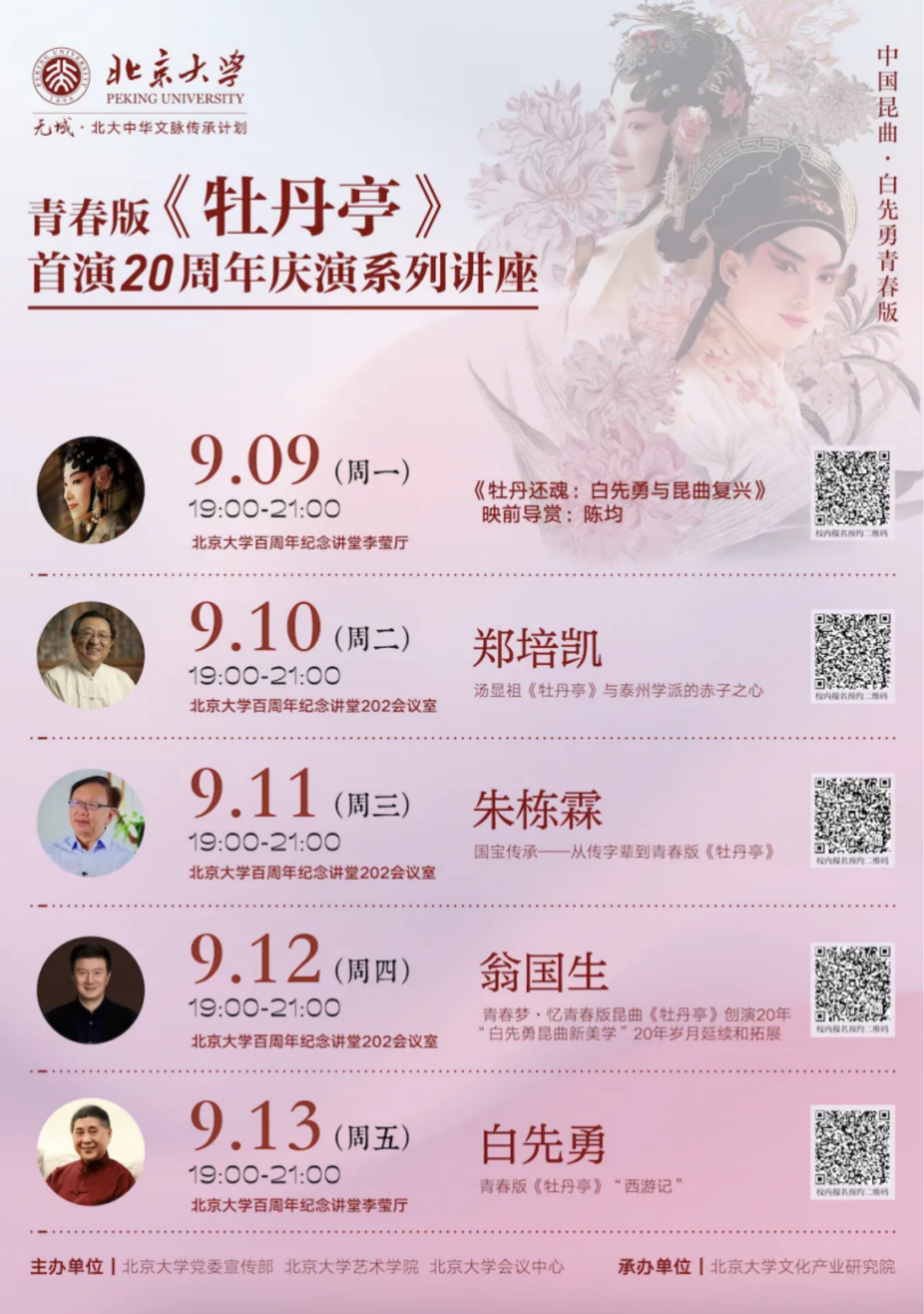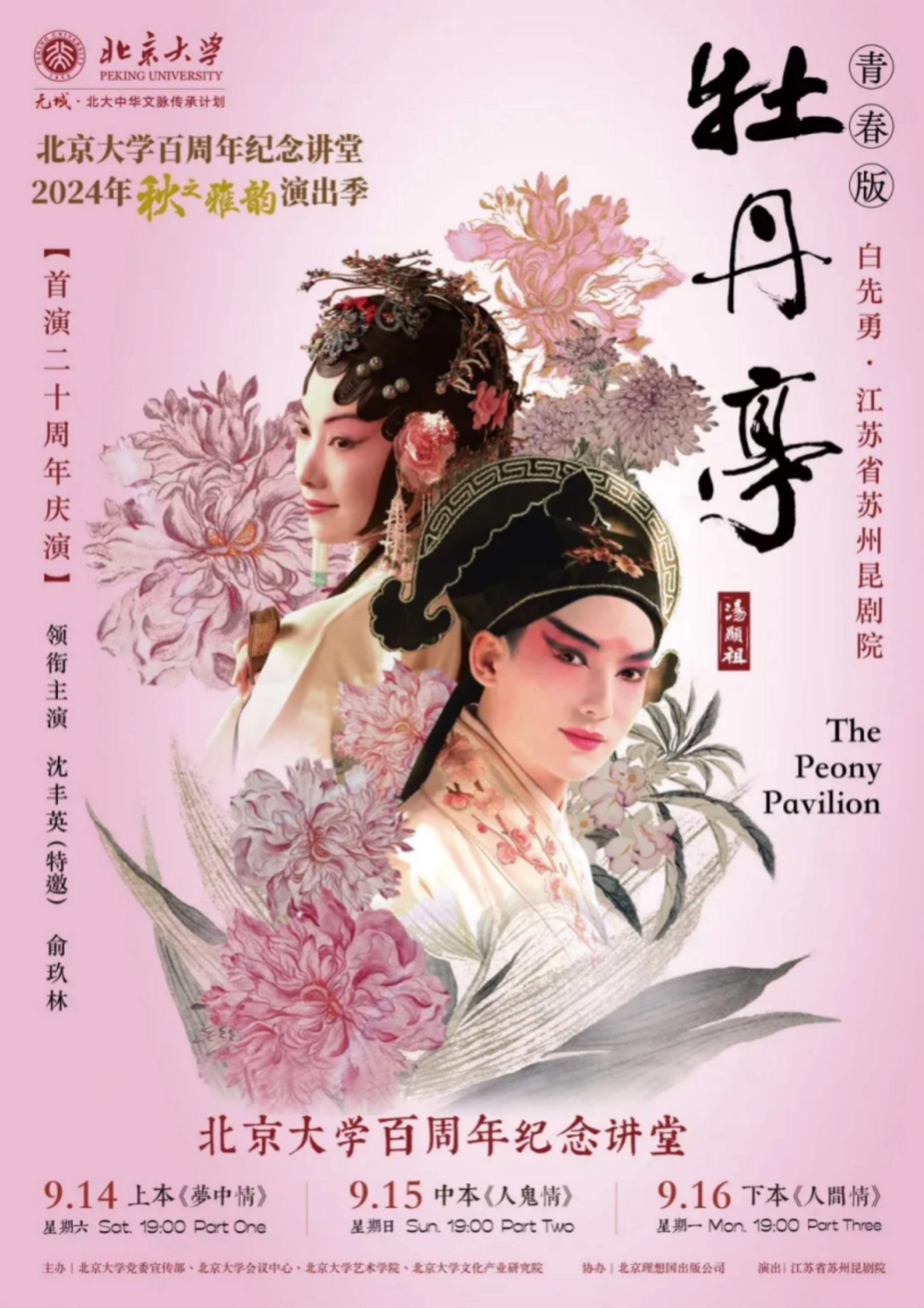 由台湾著名作家白先勇携手江苏省苏州昆剧院共同打造的青春版昆曲《牡丹亭》,于2024年9月14日晚再次走进北京大学,在这所百年学府重现中国文学美丽的爱情神话。此次活动起源于2009年,白先勇与北京大学文化产业研究院共同发起“白先勇北京大学昆曲传承计划”,其后他连续十年到北大授课。从课堂教学到学者研究,从社团爱好到舞台表演……在北大,听昆赏昆、学昆唱昆始终如杜丽娘花园般“姹紫嫣红开遍”。多家专业昆曲院团与北大缔结友谊,经典昆曲剧目与折子戏在北大上演,在青年群体中广结知音;讲座交流、艺术课堂等多种形式的合作机制,为北大培养了大批能懂昆曲、理解传统艺术之美的高素养观众群体。