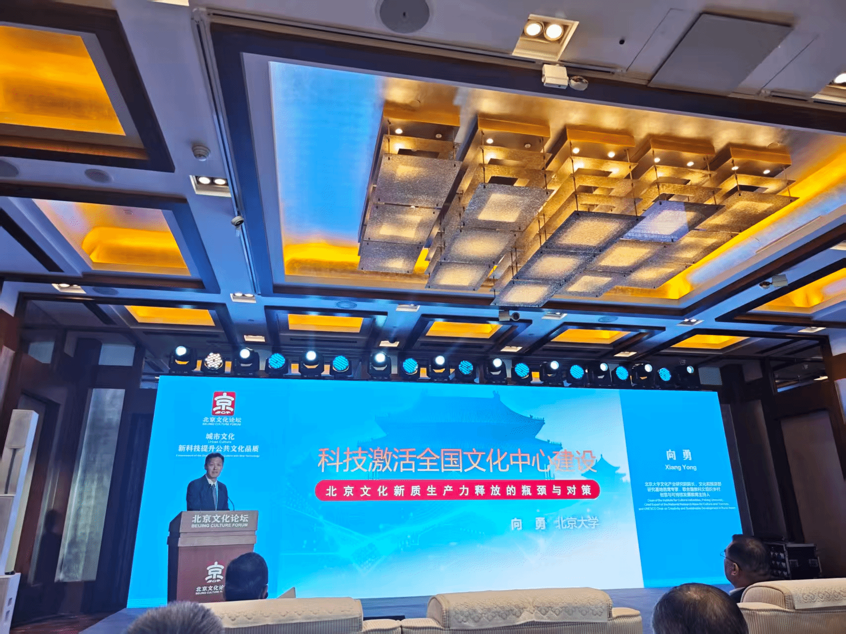 9月23-24日,文化产业研究院院长向勇参加了由中宣部、文化和旅游部作为指导单位,北京市推进全国文化中心建设领导小组办公室、北京市委宣传部主办的北京文化论坛,在平行论坛“城市文化:新科技提升公共文化品质”上发表了“北京文化新质生产力释放的瓶颈与对策”主旨报告。