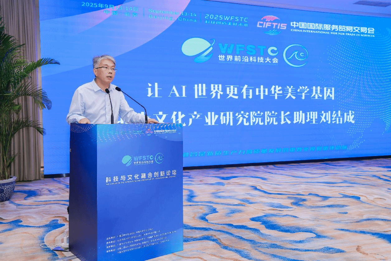 9月13日,2025中国国际服务贸易会配套的世界前沿科技大会科技与文化融合创新论坛在北京万寿宾馆召开,研讨主题包括人工智能、可靠性与系统工程,论坛包括文化领域的多位院士、专家的学术报告。文化产业研究院院长助理刘结成参会并发表“让AI世界更有中华美学基因”主题演讲,并介绍了文化产业研究院自主研发的中华美学基因库项目。