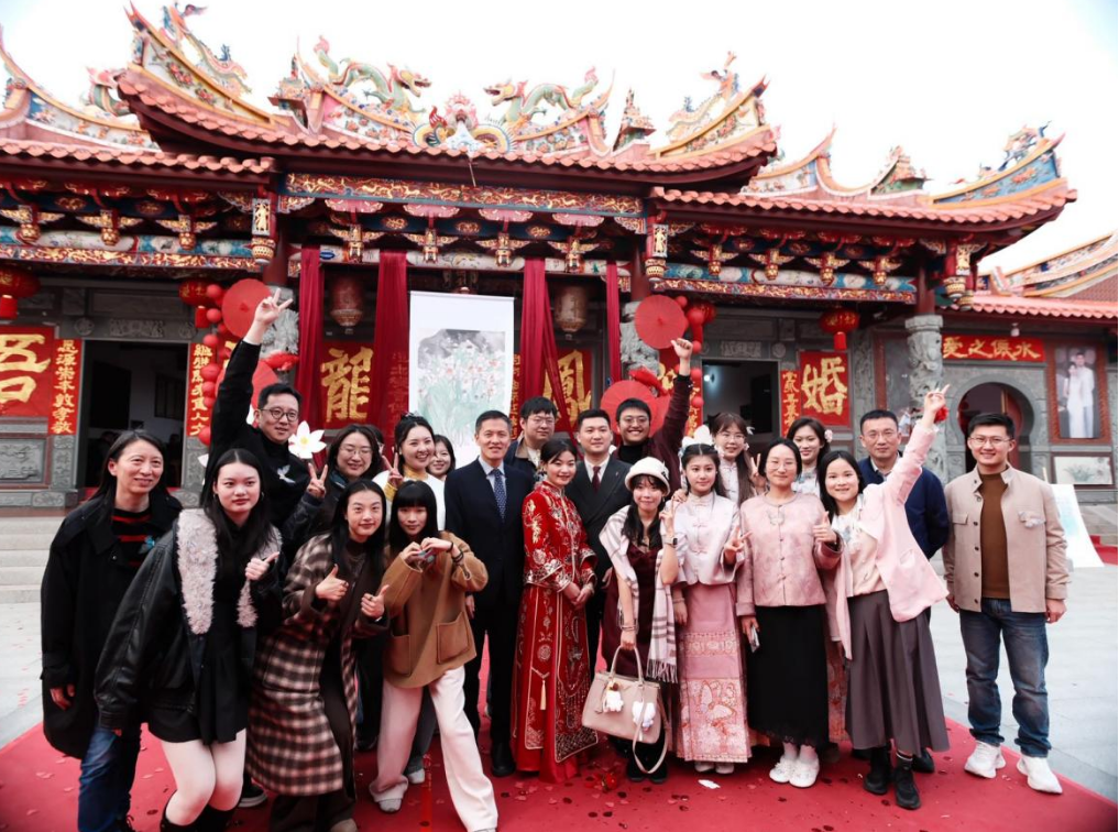 “寻美中国”漳州站的活动之一——见证北京大学文化产业研究院硕士毕业生黄彬彬与中央美术学院硕士沈继泓的宗祠婚礼。两位新人同为漳州籍,大学期间因共同的艺术追求与人生理想相知相恋,婚礼选址家乡漳州市芗城区天宝镇山美村沈氏宗祠,以漳州市花水仙花为核心元素举办艺术作品邀请展。现场有水仙花艺、布袋木偶戏、锦歌等漳州非遗项目,让婚礼成为“沉浸式文化美学体验”,完美诠释了青年一代对乡土情怀与文化传承的坚守。