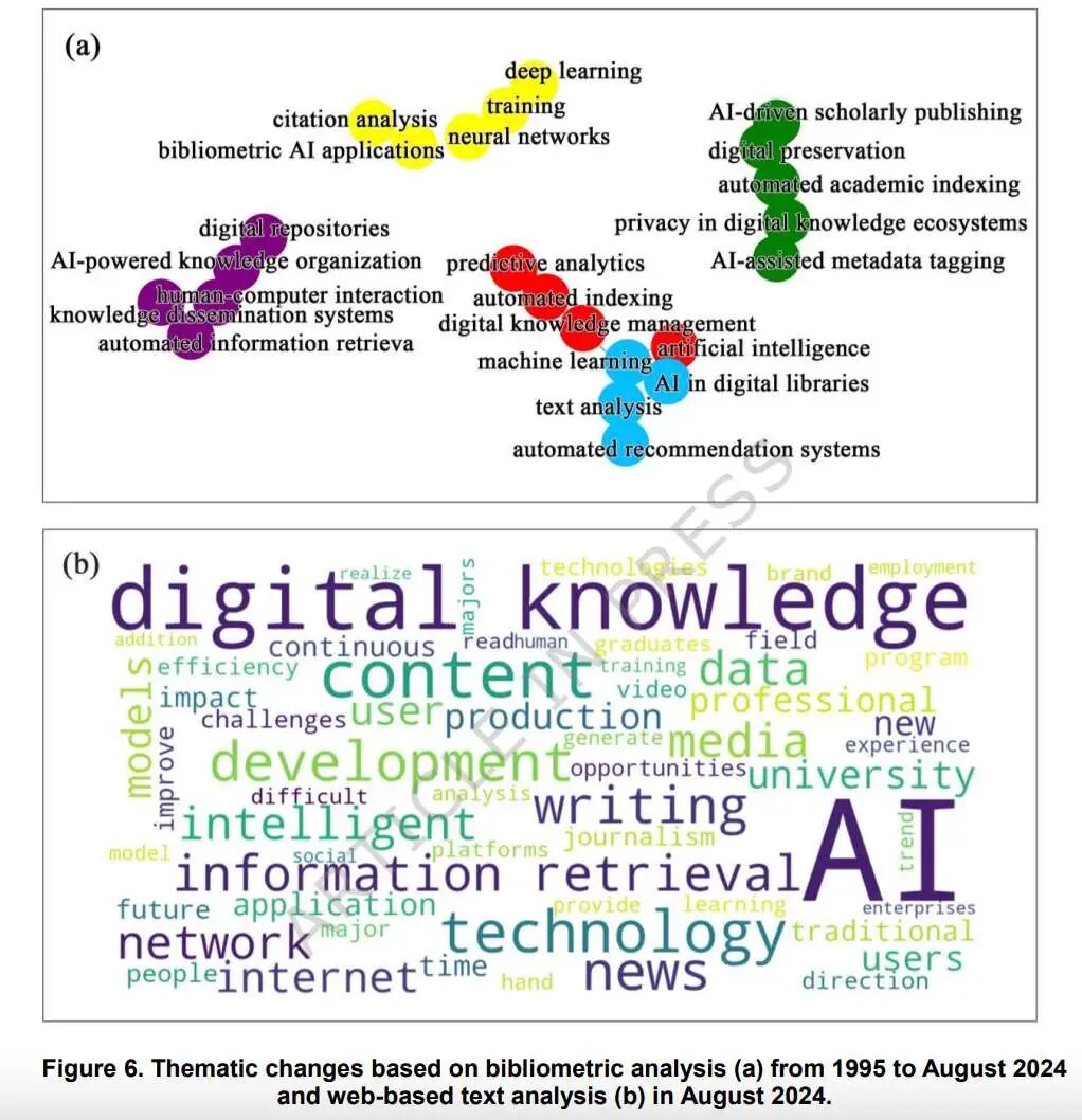 2.提供了清晰的演进图谱:首次系统勾勒出近三十年来AI在数字知识管理领域从“概念萌芽”到“深度融合”的完整发展阶段和主题迁移路径。