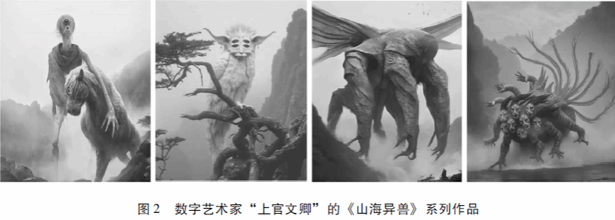 人工智能的影像创造具有绝对“去中心化”的潜力,很容易使人联想到唐娜·哈拉维(Donna Haraway)提出的“克苏鲁世”(Chthulucene)的视觉景象。哈拉维在1985年发表了著名的《赛博格宣言》后,又在21世纪与赛博格想象话别,发表了惊世骇俗的《伴侣物种宣言》,并在2016出版了《与忧虑共存:在克苏鲁世建立亲缘》。所谓克苏鲁世,并非指恐怖小说家霍华德·菲利普·洛夫克拉夫特(Howard Phillips Lovecraft)的“克苏鲁神话”,而是包括历史上所有的超人类(more-than-human)、外人类(other-than-human)、非人类(inhuman)等作为集合的实体。这些新奇甚至令人生畏的异质性新物种,具有所有物种平等共生、处于“进程性”开放状态的共性。“共生”,哈拉维将其拆解为“共同—生成”(becoming-with),意味着始终与异己发生联结,消除自身的界限和中心的位置。共生是克苏鲁世的世界观,也是生成式想象世界中重塑生命的逻辑。例如,图2为数字艺术家“上官文卿”与生成式AI合作,根据《山海经》创造的想象世界。这些不完全由人类创造的奇珍异兽,让某种“虚无”的恐惧感苏醒,将“此在”从熟悉、习惯和安全的“日常”中拉扯出来,或许反而撕开了让“消失的他者”浮现的缝隙。其实,人工智能并不是真的“想象”出了什么新的东西,只是打破了一个看不见的枷锁,无论是赛博格还是克苏鲁世,都具有驳斥人类中心主义的潜能,将人作为万物之尺的主体性搁置,从而解锁“后想象力消费”时代的异质想象世界。
