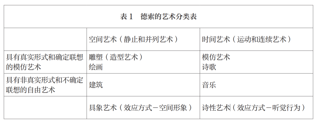 与风格识别类似,艺术分类也多半采取二分的方式,如时间艺术对空间艺术,视觉艺术对听觉艺术,模仿艺术对自由艺术等。例如,德索的艺术分类就是按照二分原则进行的,如下表所示: