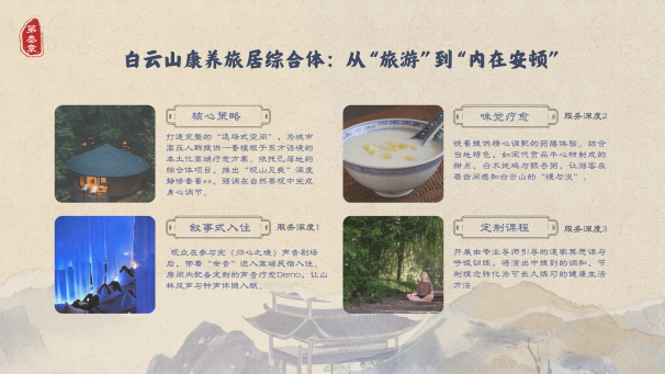 项目敏锐捕捉到当下超8.3亿中国人存在的“身心安顿需求”,并指出传统文旅“高刺激、强说教”模式的不足。基于此,团队以白云山村“低强度、慢节律”的内生价值为竞争力,将其打造为一个“可以被体验的修行叙事剧场”。