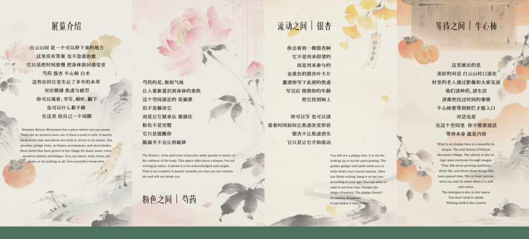 展览以芍药、银杏叶、牛心柿、白术四种本土药材为载体,分别对应情绪松弛、焦虑流动、对话等待、身心休憩四大现代情绪主题。每个展区通过沉浸式场景设计、互动体验与治愈系文案,营造出可感知、可参与的情绪疗愈场域。工作坊环节特别邀请村民参与指导,既增强了文化传承的真实性,也为本地就业提供了新路径。