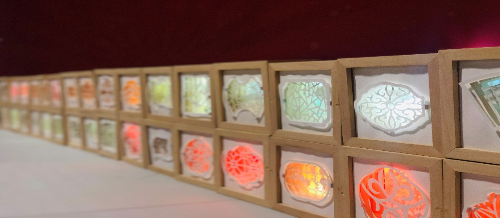 数字艺术装置作品《浮生旧梦》由艺术家曹原创作。艺术家在作品中用卡纸、柏木、硫酸纸和LED灯等材料创作了一个个小小的窗格,透过窗格,可以观看到一幕幕精彩的叙事场景。“易步移景”、“花窗窥园”作为中国独特的审美范式,是审美距离在中国文化中的极致发挥。透过数字窗棂,观众重温着浮生旧梦,感受中国园林的意趣。
