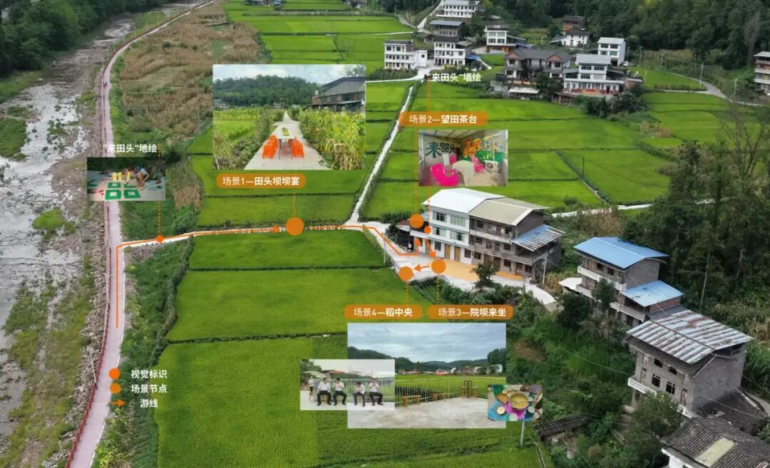 本项目以“在地文化的当代表达”为方法,将院坝从“路过的场所”转为“停下来的场域”。我们沿最常行走的路径采取“一线多点”的带状组织,以“田字四口”布置四个可停驻节点——田头坝坝宴(共食与信任)、望田茶台(边界友好与在地认知)、院坝来坐(日常社交与代际对话)、稻中央(媒体化表达与交易转化)——让空间、叙事与参与机制同步发生。