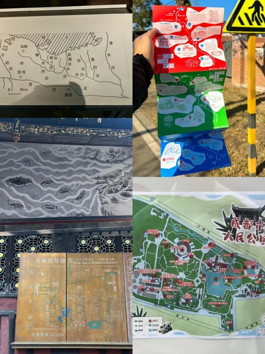 在策划过程中,团队收集整合了各形各色的地图作为借鉴(如图),最终决定以导览地图为基础,将毕城村一些无法由导航系统来呈现的区域一并体现到手绘地图当中(例如地图中的下河摸鱼点、休憩点、拍照打卡点等),并尝试在地图中设计适合不同人群的毕城村游玩路线。