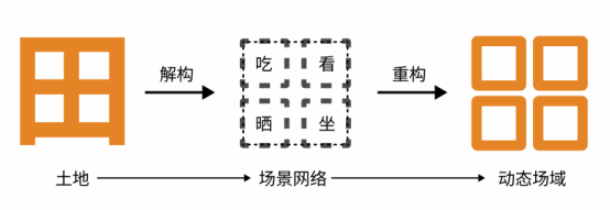 2.空间目标:以“田字四口”的一线多点串联,形成可停驻、可参与、可使用的动态场域;