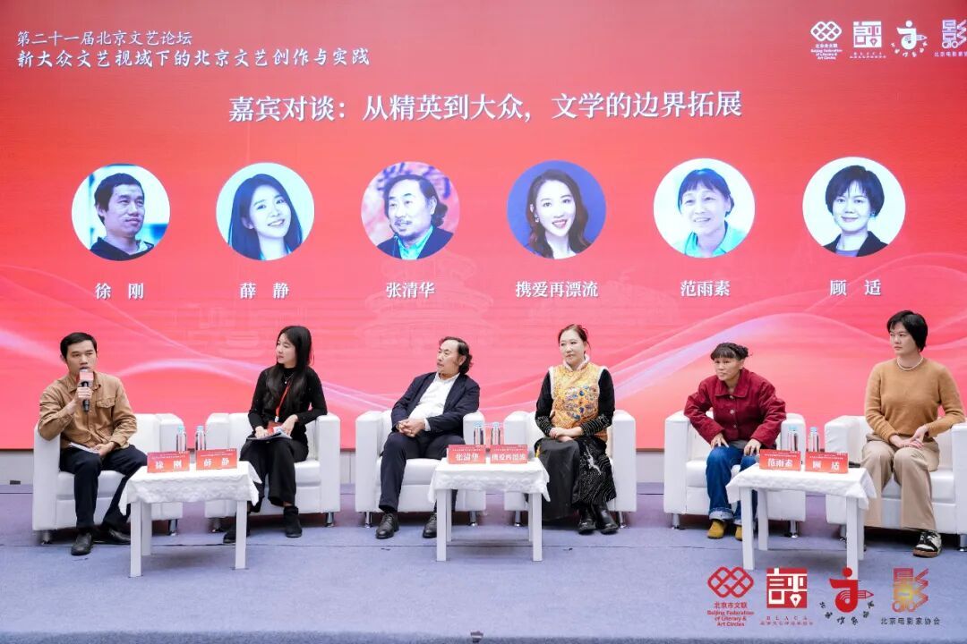 在“从精英到大众,文学的边界拓展”单元,中国社会科学院文学研究所研究员徐刚表示,文学的边界拓展一是纵向地从精英文学向大众文学下沉,二是横向地向影视等领域拓展。北京评协副主席,北京师范大学文学院教授、国际写作中心执行主任张清华表示,新大众文艺既有大众的一面,也有通向精英的一面,依然会传承古老而永恒的文学传统。北京作协网络作家分会副主席、网络作家携爱再漂流表示,数字技术让网络文学搭上了“出海”的快船,打破了空间、受众和价值观的边界。清华大学人文学院讲师薛静表示,文学从过去书房里的一盏孤灯变成现在热带雨林般的生态系统,正在变成改编或其他文艺形式的源代码。作家范雨素表示,文学在当下的社会功能就是让每个人都可以被看见。科幻作家、中国城市规划设计研究院高级城市规划师顾适表示,新大众文艺应尽可能地用大众能够听懂的语言去表达。